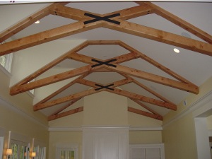 April 14, 2009 -- The trusses are now complete with all of their hardware installed. This is the view looking toward the kitchen.