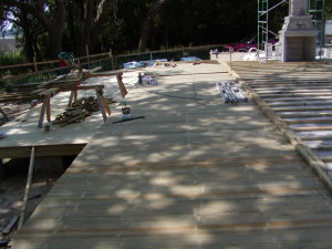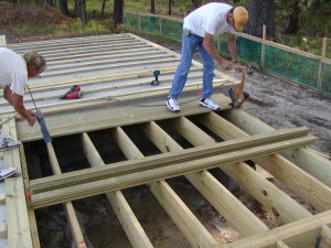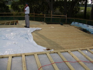 August 5, 2008 -- The plywood subfloor is being installed. The deck (on the left) is covered with plywood to protect the decking material during the construction process.