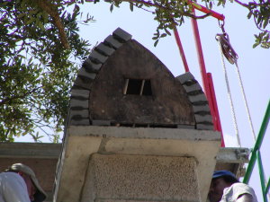 August 1, 2008 -- The top has a bishop's cap. The plywood is a form to hold the bricks in place until the mortar sets. Below the bishop's cap will be stucco.