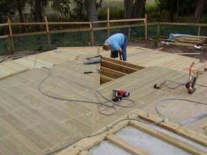 August 1, 2008 -- The back porch decking is being installed. It is tongue and groove pine Each board is glued down to the joists.