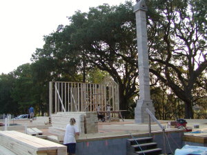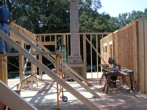 August 15, 2008 -- This is the first public view of Mary's Studio. The gable at the back is over the master suite. The steps up are behind the carpenter.