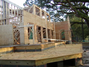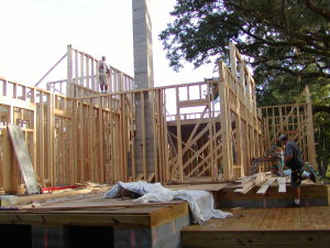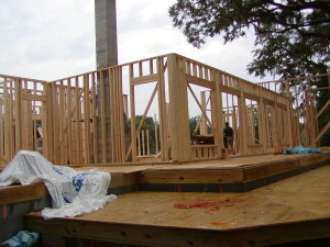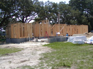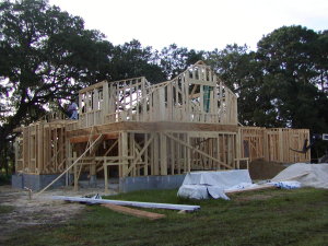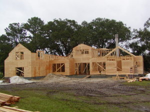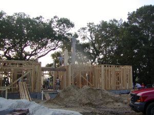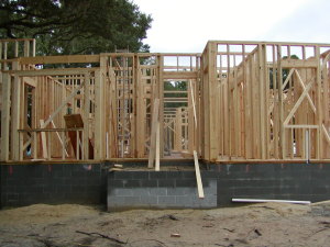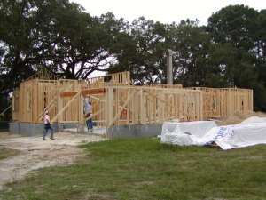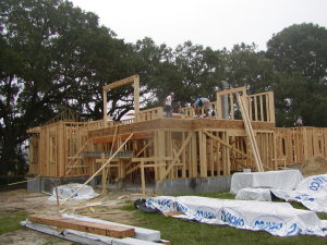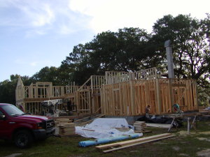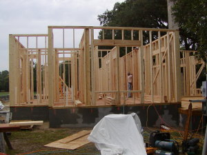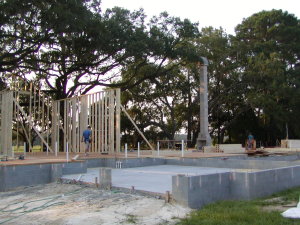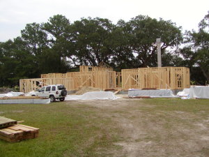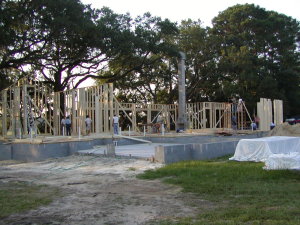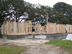 August 8, 2008 -- The walls of the south side of the house are pretty well framed. There was a heavy rain last evening. The concrete block foundation is still wet.