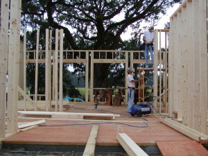 August 11, 2008 -- The walls of the house were up on Friday which was the scheduled goal. Today, garage walls will be erected.