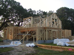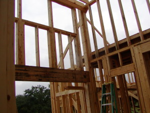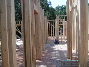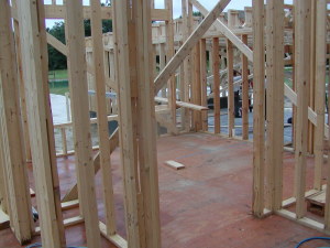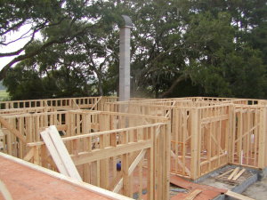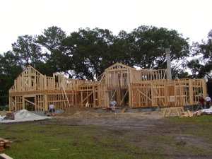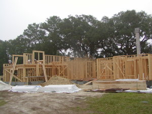 August 12, 2008 -- All of the first floor walls are framed. The garage was the last area to be framed.