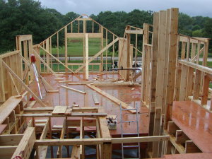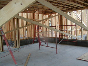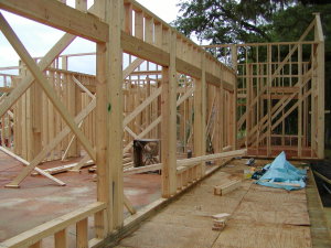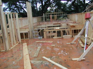 August 22, 2008 -- If you can see past all of the bracing, you can see the size of the great room. The lower roof in the background covers the kitchen area.