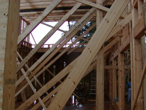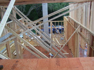 August 21, 2008 -- The great room has a lot of bracing to hold walls straight and plumb until ceiling joists, rafters and plywood are in place.