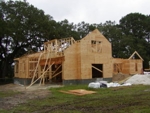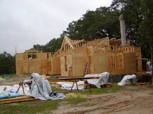 August 22, 2008 -- From the driveway, the house is taking shape. The plywood on the walls should be completed in a day or two depending upon the weather.