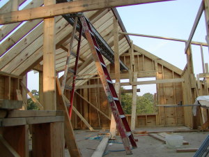 August 28, 2008 -- More rafters are up. The dormer in Mary's studio (over the garage) is taking shape. Before long plywood will be going on the roof.
