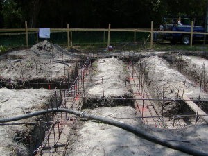 July 1, 2008 -- Steel rebar is being put in the trenches. Vertical rebar will tie the footers to the block walls that will be laid on the footers.