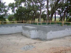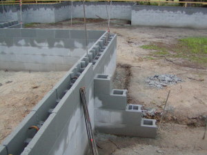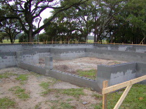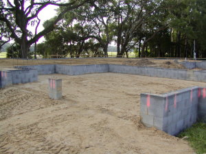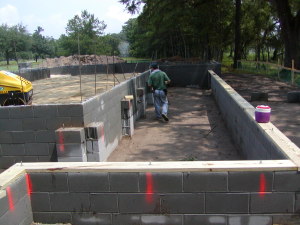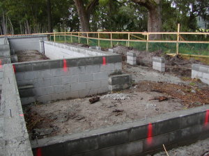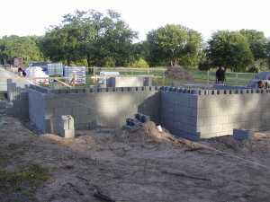 July 8, 2008 -- The footers are in. Block is distributed and being laid. Note the dust where blocks are being cut to fit.