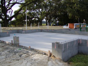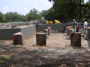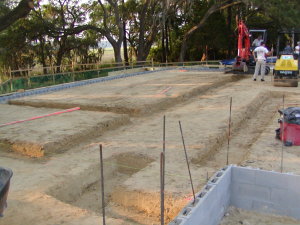 July 22, 2008 -- Trenches are being dug for grade beams. They are basically footers to give the floor extra strength under walls. The rebar sticking up from the blocks will be bent over and cast in the slab.
