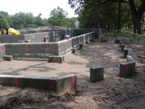 July 10, 2008 -- The house block is finished except for a small section in the front. Fill dirt will be brought in through this opening.