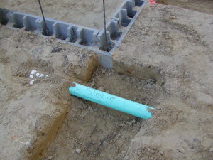 July 23, 2008 -- When the drains had to run through the grade beams, a sleeve was put over the pipe for protection from the concrete. The fittings (on the left) were left exposed for the inspector. They will be covered with dirt and plastic before the slab is poured.