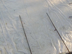 July 28, 2008 -- The rebar that was sticking up from the walls has been bent over to tie in with the slab. You can see the vinyl with the rebar over it. Concrete is being poured over the vinyl.