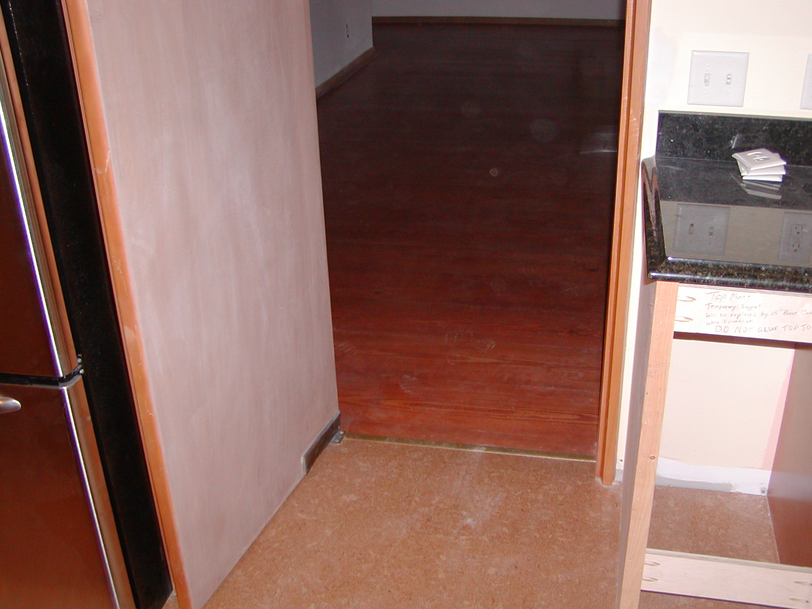 September 22, 2007 -- The thresholds are in place in most doorways. The final coat will be put on the dining room floor this week. The protective paper has been removed from the kitchen floor. | ![]() |