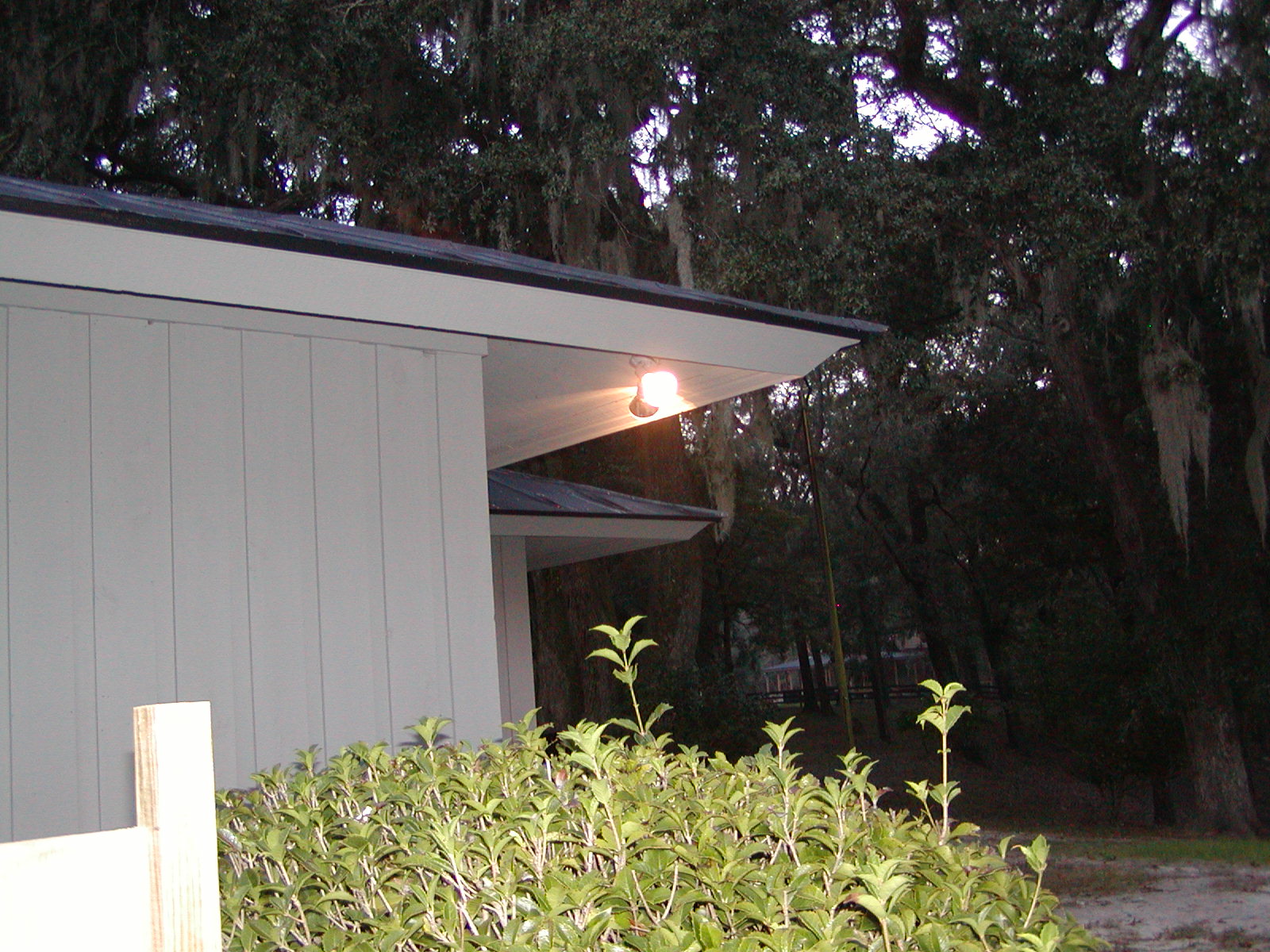 October 16, 2007 -- Floodlights are now installed at two corners of the house. They are on a dimmer. This corner is the kitchen. The other corner (not shown) is the master bedroom. | ![]() |