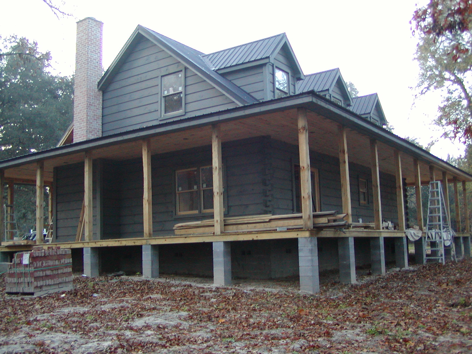 November 30, 2007 -- The outside of the cabin is being stained. A color for the porch ceiling has not been decided yet. The exterior will need chinking in the grooves. | ![]() |