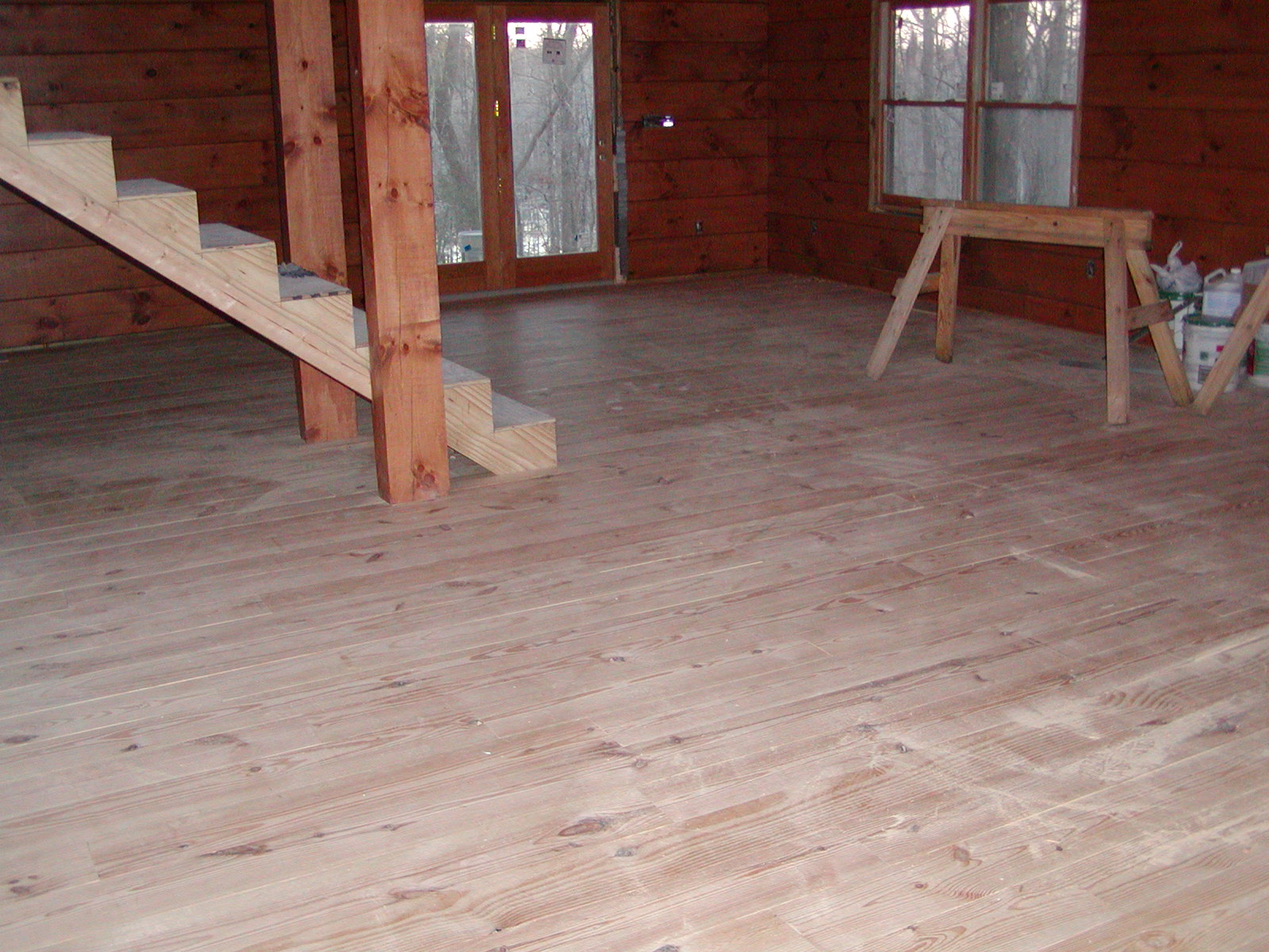February 8, 2008 -- The new heart pine floor is down in the cabin. Sheet rock will be sanded as soon as the joint compound hardens. | ![]() |