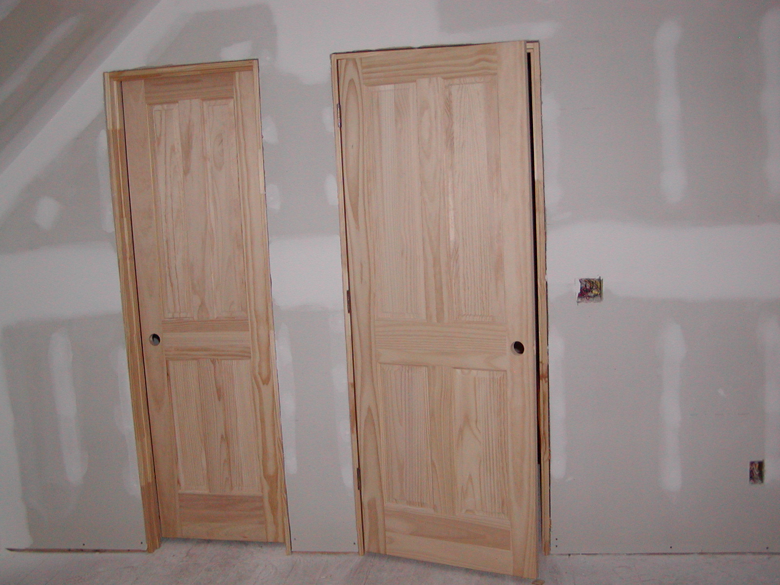 February 13, 2008 -- Interior doors are being hung. This is in the west upstairs bedroom. The door on the left is to the bathroom. The door on the right is to the hallway and stairs. | ![]() |