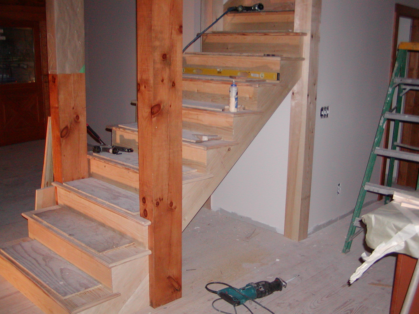 March 13, 2008 -- Risers and treads are begin installed on stairs. The plywood on each step is temporary to protect the treads. | ![]() |
