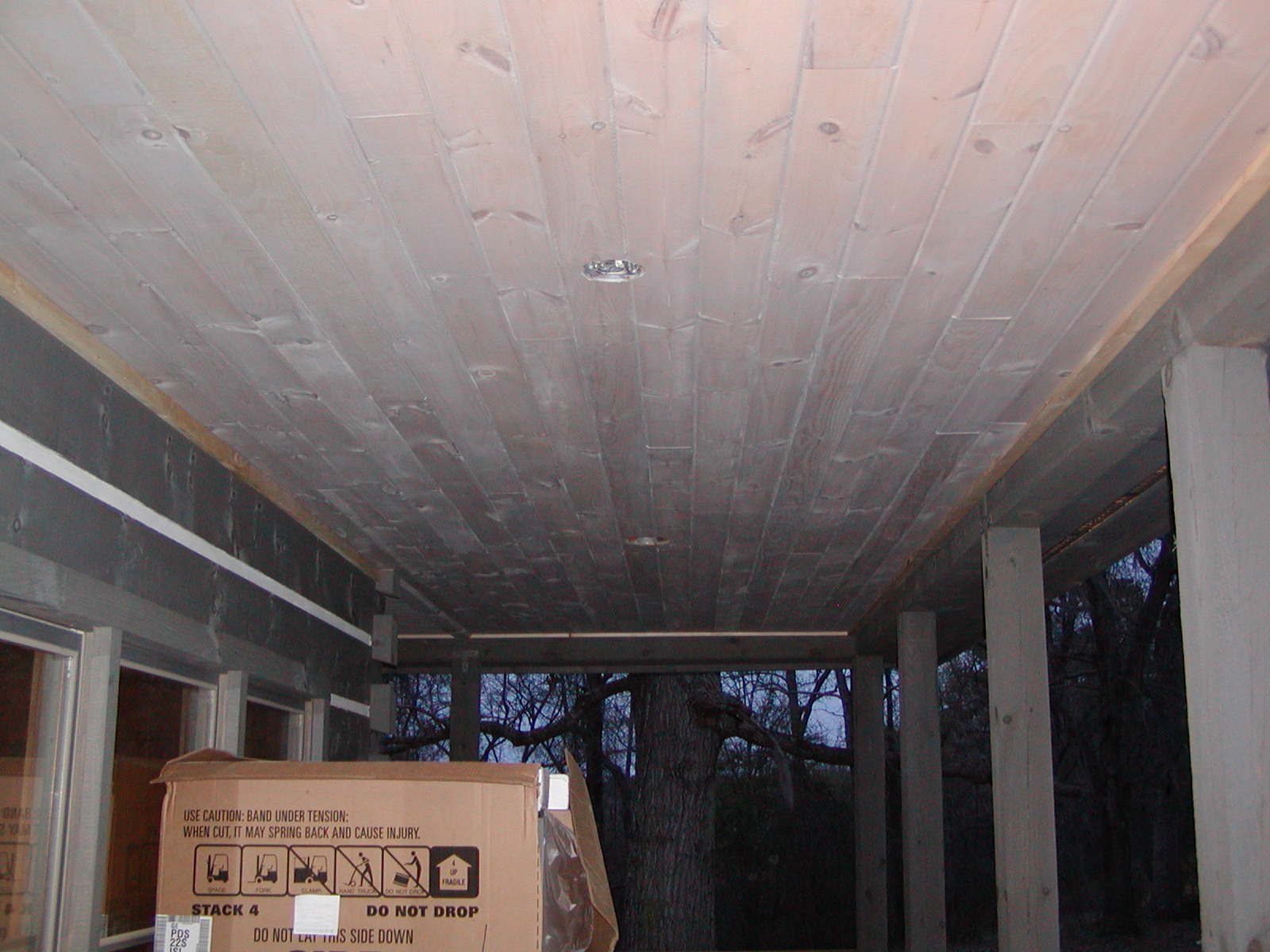 March 24, 2008 -- Trim boards were installed on the porch ceiling. There is a vertical trim board against the house and a horizontal one along the beam on the right. They have to be finished with stain to match. |