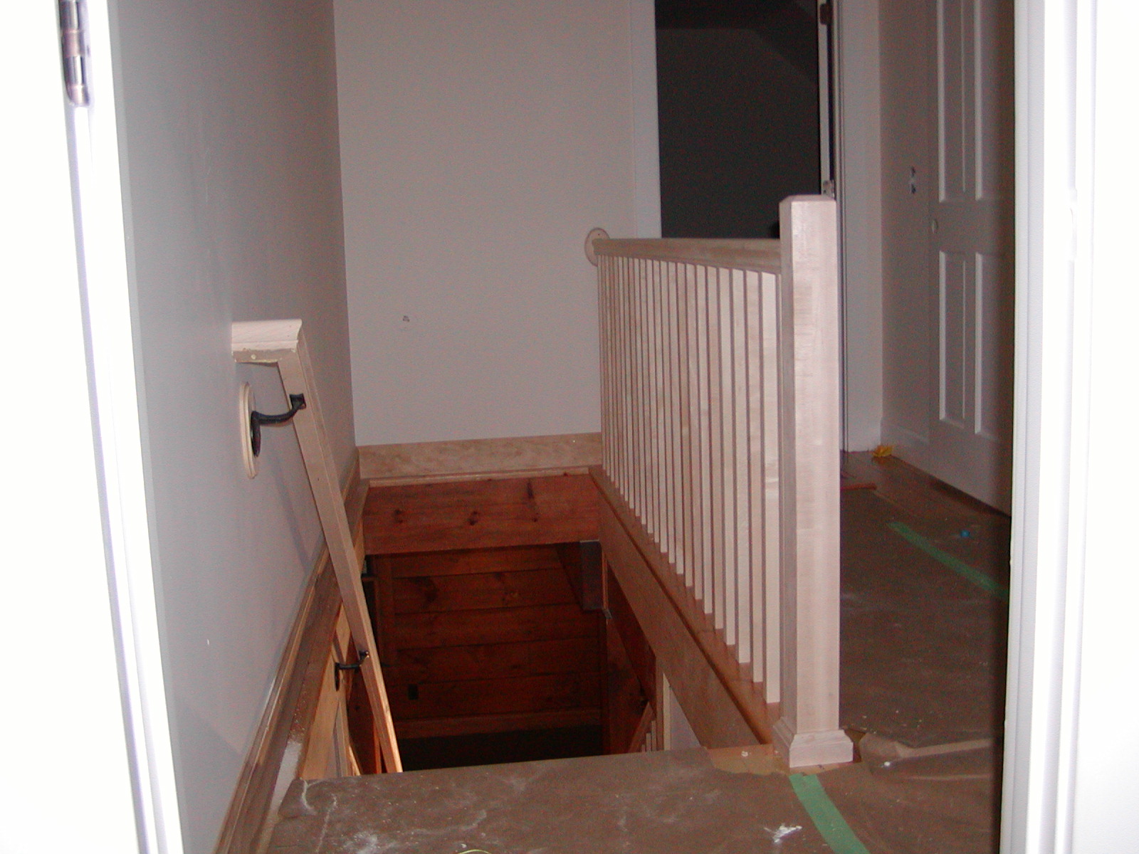 March 31, 2008 -- Upstairs, there is a handrail along the stairwell. These railings will also be stained to match the beams. | ![]() |