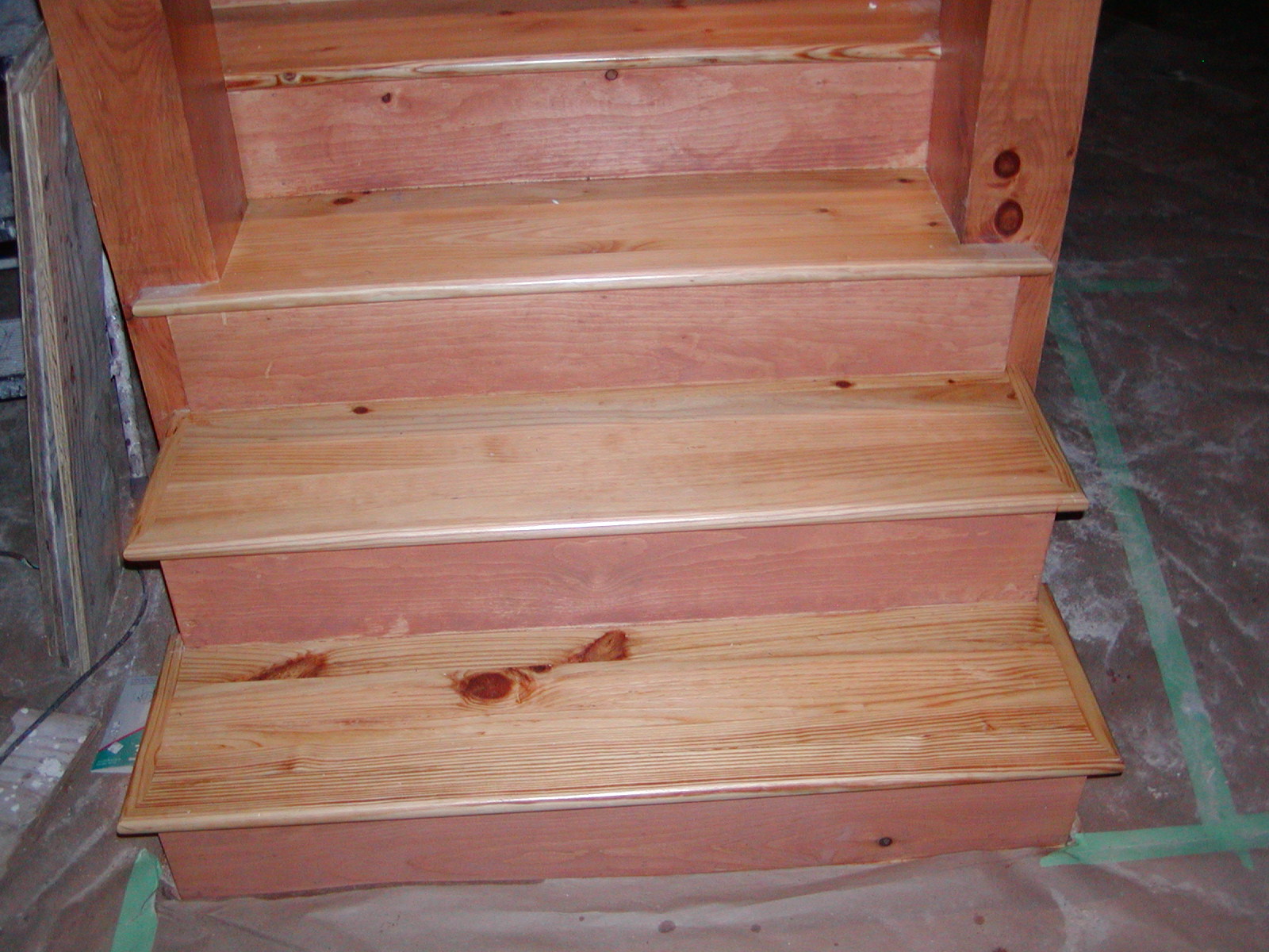 April 3, 2008 -- The stairs are uncovered to stain the risers (vertical boards). They match the cabin stain nicely. The floor still has protective paper on it. | ![]() |