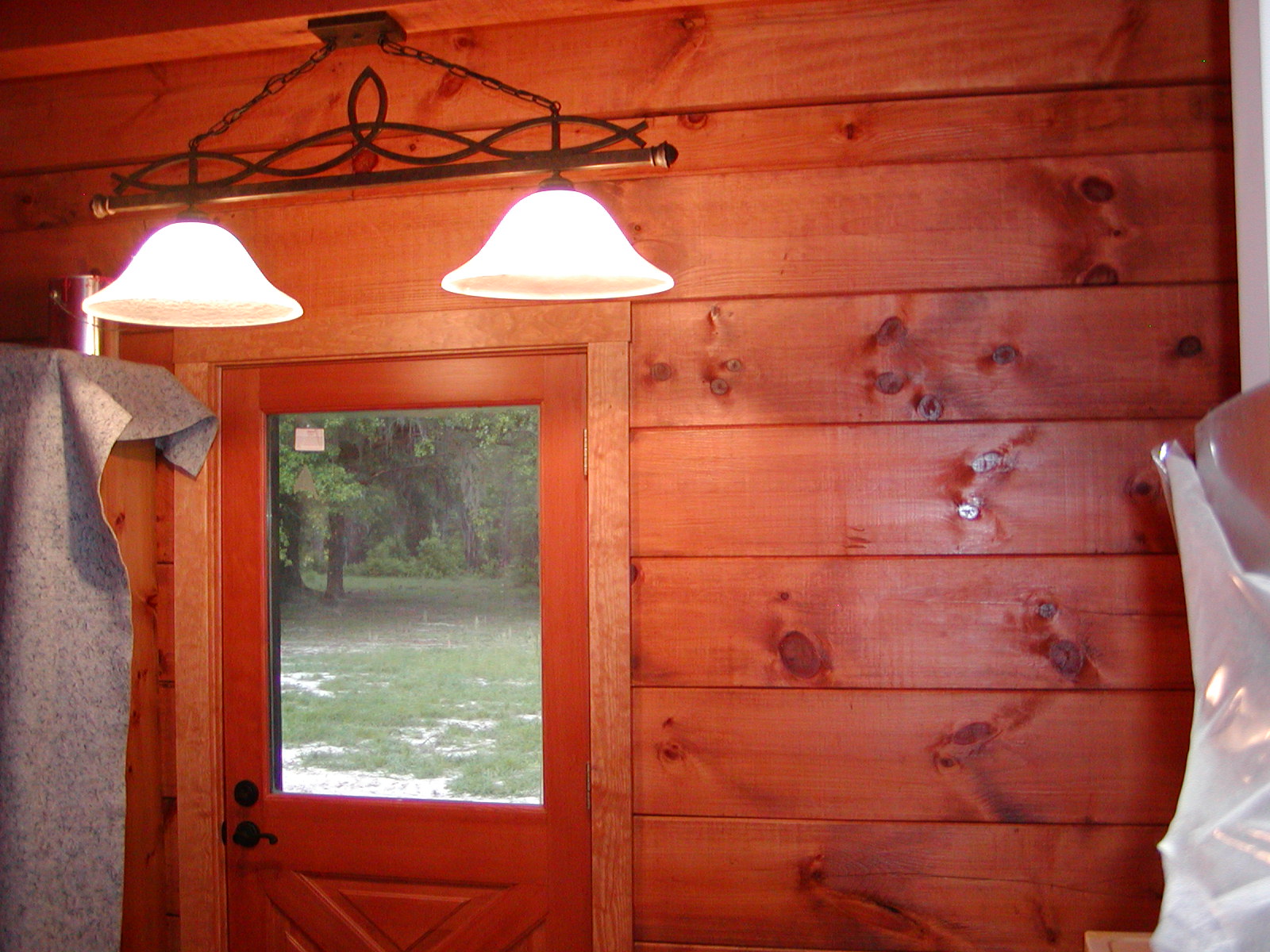May 5, 2008 -- The laundry room light is installed. The washer and dryer are to the right. A storage cabinet is under the shipping blanket. | ![]() |