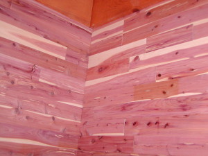 April 1, 2008 -- The master closet is lined with cedar. It will have wire shelves and rods for storage. The cabin beams are visible at the top of the photo.