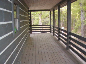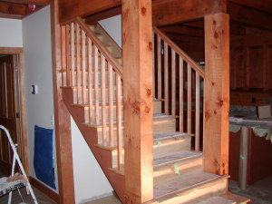 April 3, 2008 -- The stairs are uncovered to stain the risers (vertical boards). They match the cabin stain nicely. The floor still has protective paper on it.