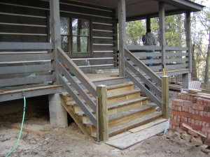 April 8, 2008 -- The cabin is getting three sets of wooden stairs. This set is just outside the mud room door. It will be stained to match the exterior.