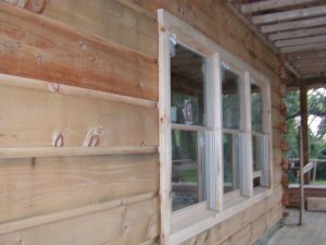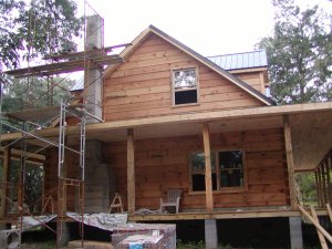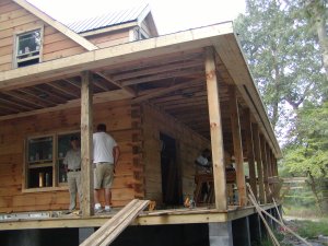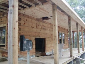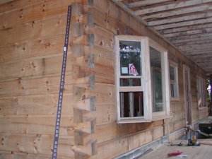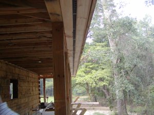 August 6, 2007 -- The porch soffits are being installed. The soffits at the front and rear of the cabin have vents as shown here.
