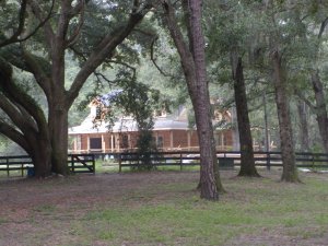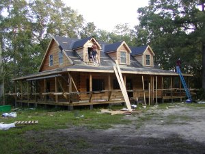 August 2, 2007 -- The log cabin looks good through the oak grove. The roofing and windows are being installed.