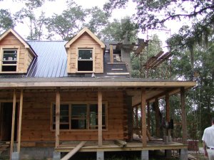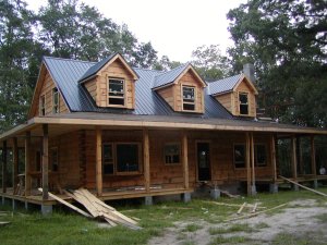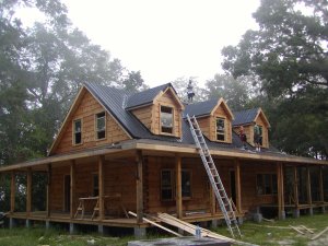 August 15, 2007 -- The steel roof is being installed. Most of the front is done. The porches will be done after the logs are stained.