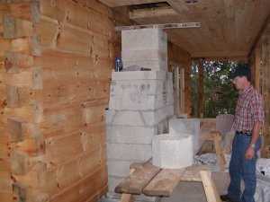 August 16, 2007 -- The Isokern fireplace is being installed at the log cabin. It will have log siding around it on the porch and brick above the porch.