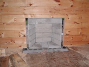 August 15, 2007 -- The hole is cut for the fireplace. Another hole is also cut in the ceiling for the chimney. The Isokern is being installed today.