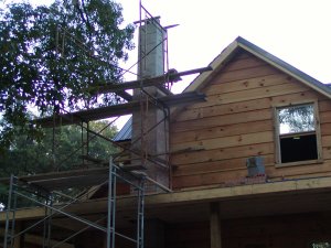 August 17, 2007 -- The chimney will be brick from the porch roof upward. The brick will be laid in the next few days while the scaffold is still up.