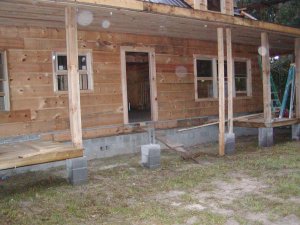 August 14, 2007 -- The outside of the cabin is intact. You can see where the firebox will be installed in the porch floor.