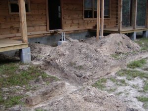 August 27, 2007 -- Trenches are dug for the front brick patio footers. Stairs will go down on the left and right sides.