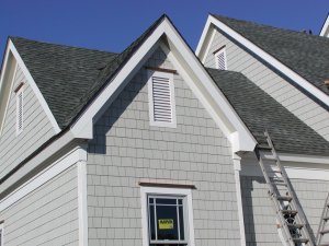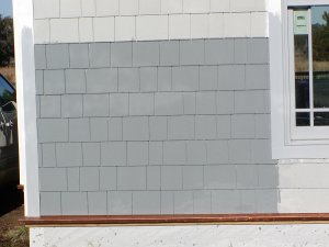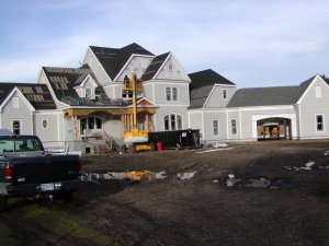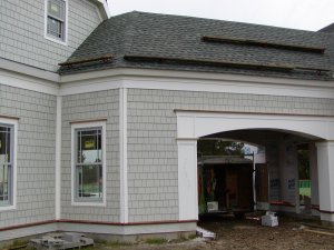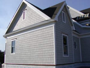 February 16, 2007 -- The south east corner of the house now has exterior trim, siding and shingles. Painting will begin in a few days.