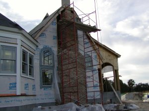 February 9, 2007 -- The single car garage and porte-cochere have shingles on the roof. The drive through trim has been started.