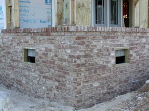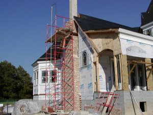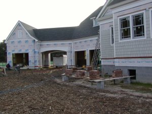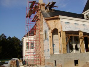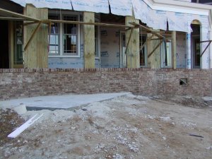 February 19, 2007 -- The brick work around the rear porch has begun. Now the exterior trim at the back porch can proceed.