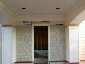February 15, 2007 -- A view from the double car garage to the single car garage through the porte-cochere. The ceiling is bead board. Siding needs to be completed on the garage wall.