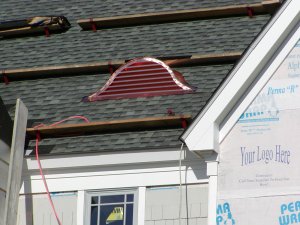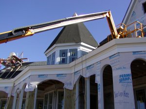 February 22, 2007 -- The shingles are nearly completed. This is the first of six roof ornaments. The horizontal boards are temporary "toe boards" for the roofers to use. They will be removed in a day or so.