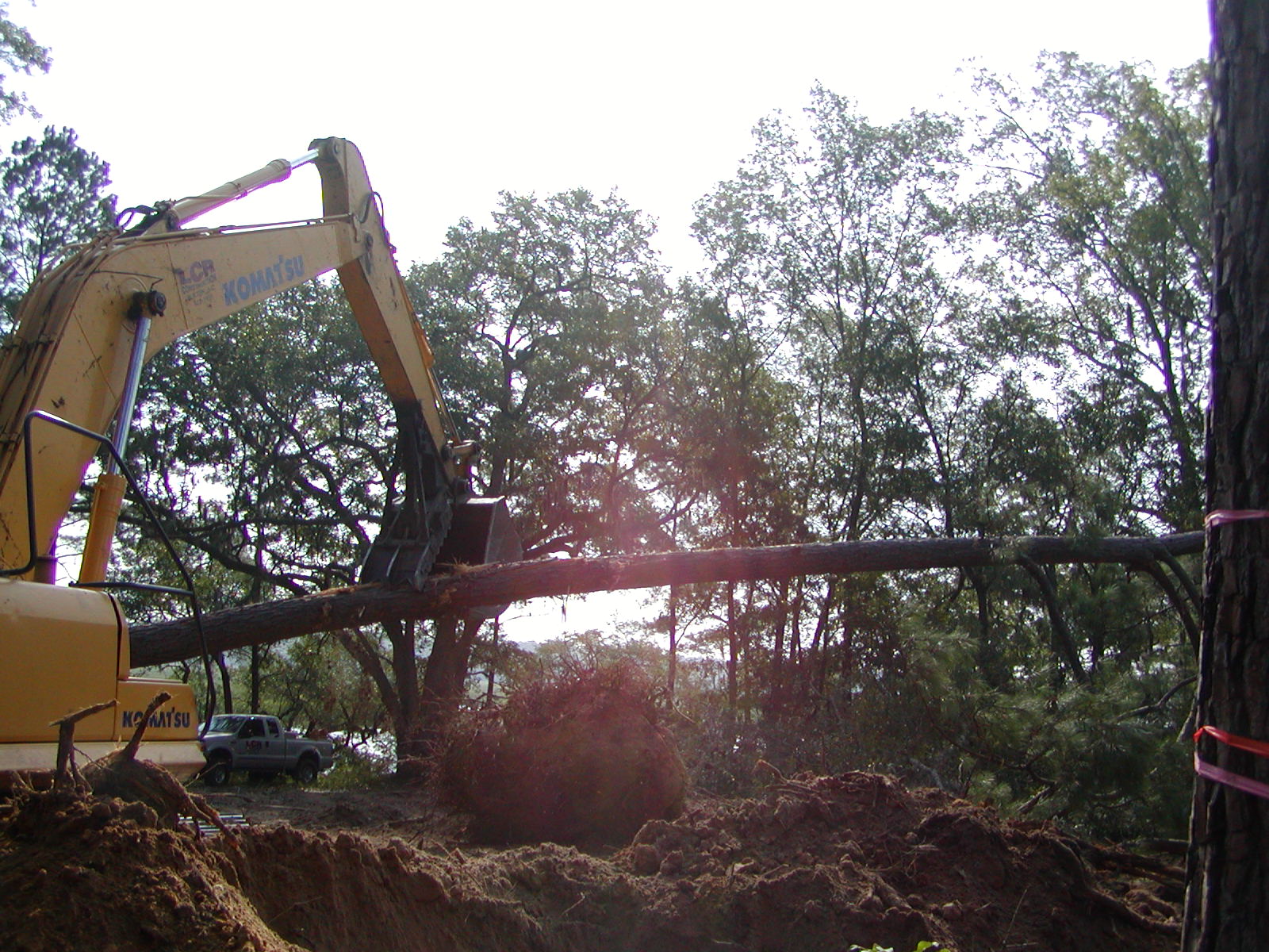 August 2, 2007 -- The track hoe crushed this 8" pine tree with its jaws a moment after this photo was taken. Who needs a saw? | ![]() |