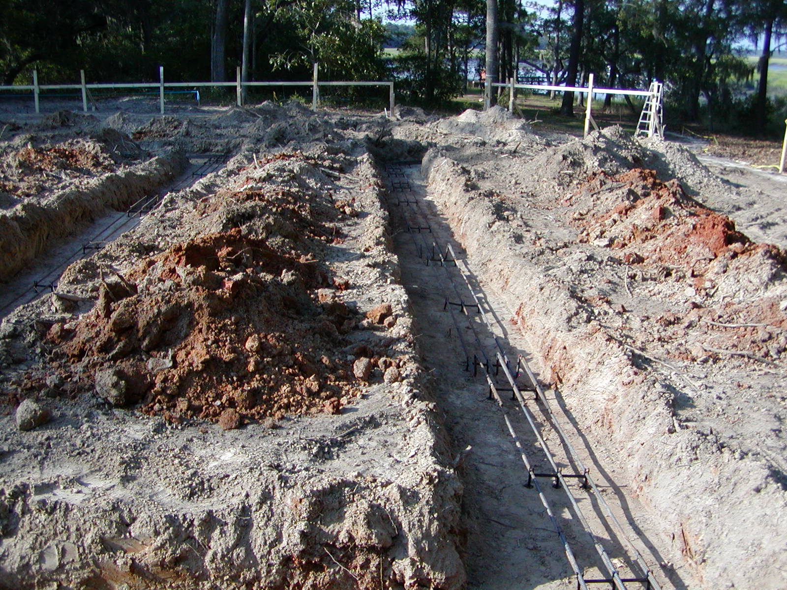 September 11, 2007 -- This is the northeast corner of the house. The batter boards are level with the ones in the previous photo. The stepladder at the right end of the batter board is a little over 6 feet tall. |
