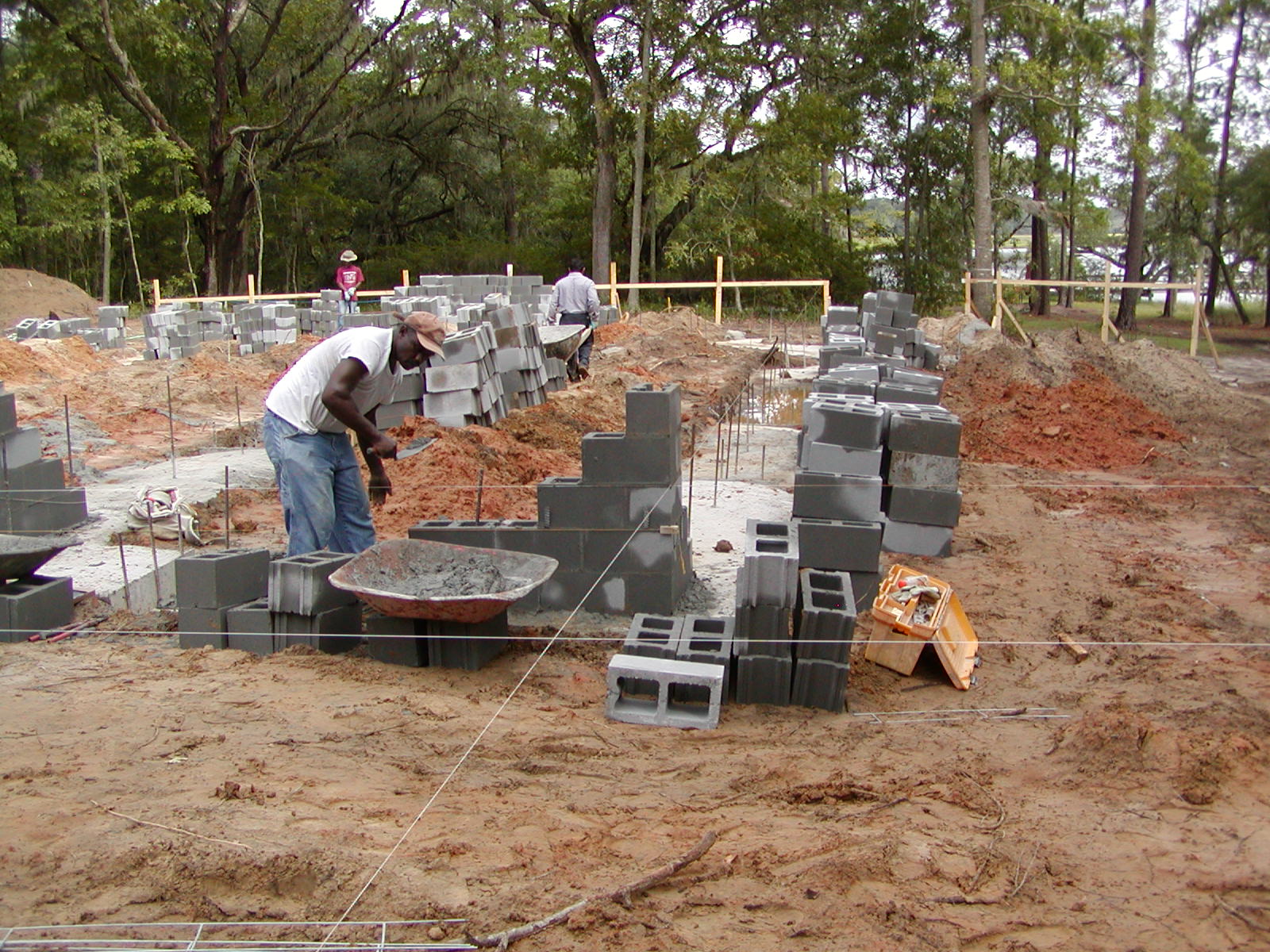 September 14, 2007 -- The corners are laid up first. Strings are pulled as a reference for the block locations. The block are laid over the vertical rebar embedded in the footer. | ![]() |