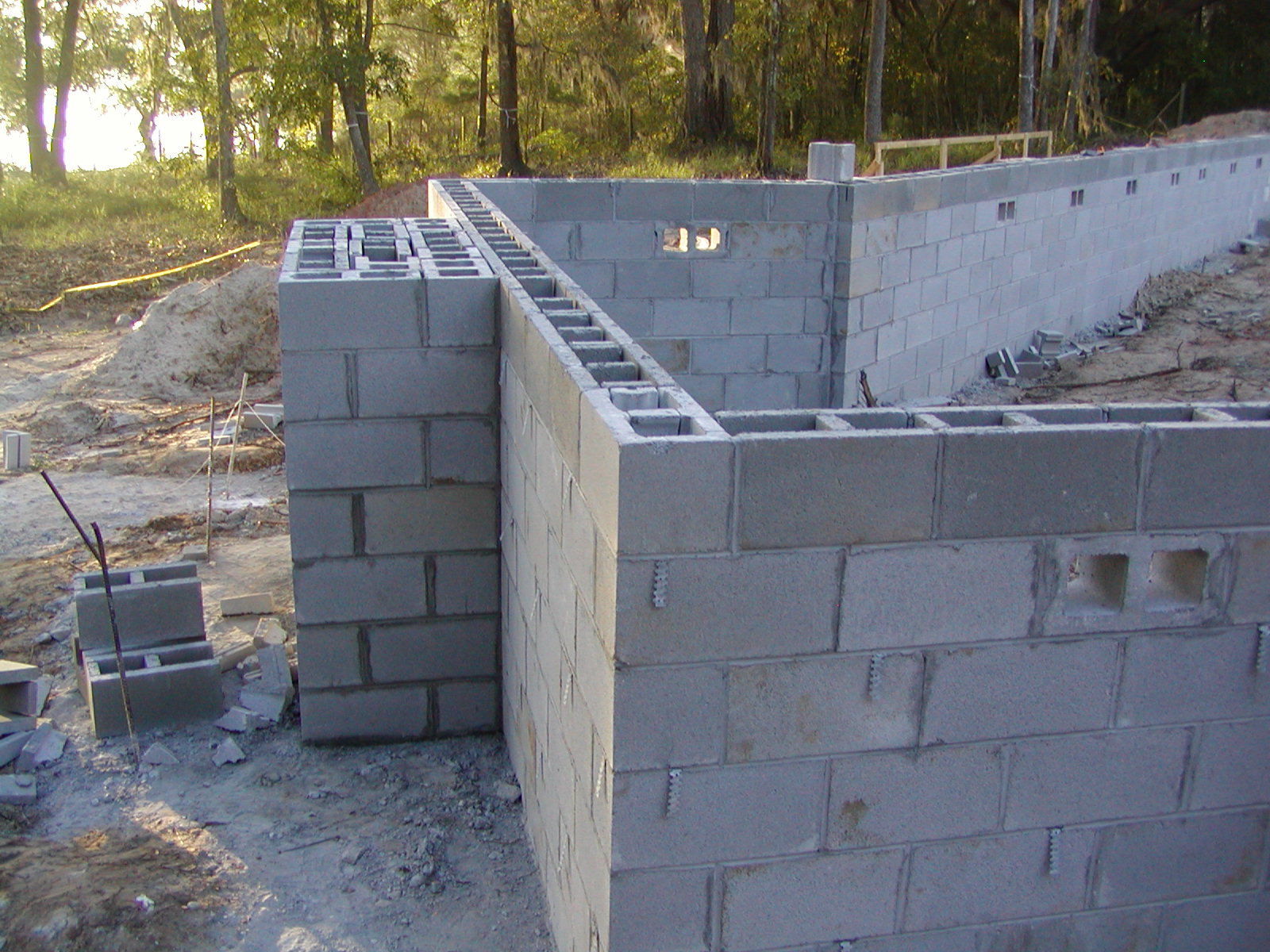 September 26, 2007 -- The fireplace foundation block is laid. When the bond beam is poured, the chimney foundation will be filled with concrete. | ![]() |