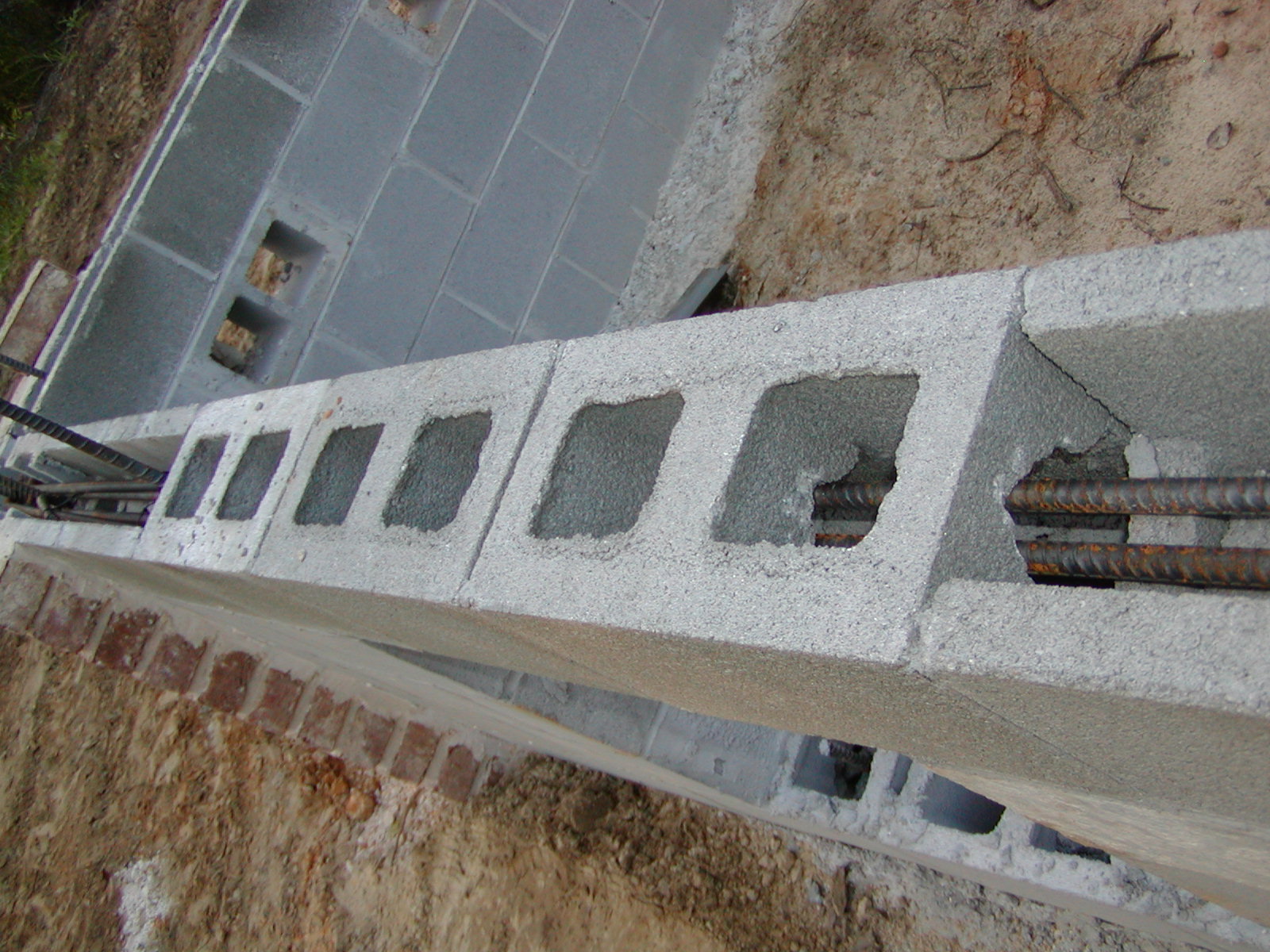 September 28, 2007 -- Where the bond beam goes over an access door, it has a steel support under it and steel rebar through it. Large threaded J-bolts will be embedded in the concrete bond beam before it sets. |