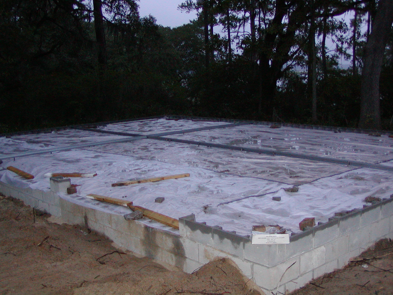October 3, 2007 -- The garage is ready to be poured except for the weather. There is a good chance of rain and that will damage the surface of fresh concrete. The metal "X" is two keyways to control the slab cracking. |